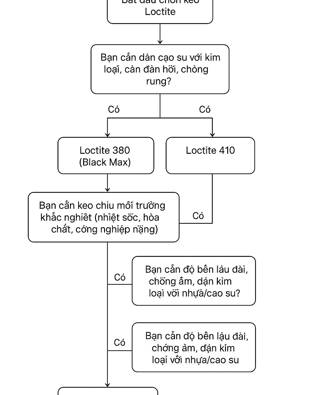 Tuyệt 👌. Tôi sẽ dựng sơ đồ dạng cây (decision tree) để bạn dễ chọn keo Loctite 380, 410, 438, 480, 4210 theo ứng dụng phổ biến: